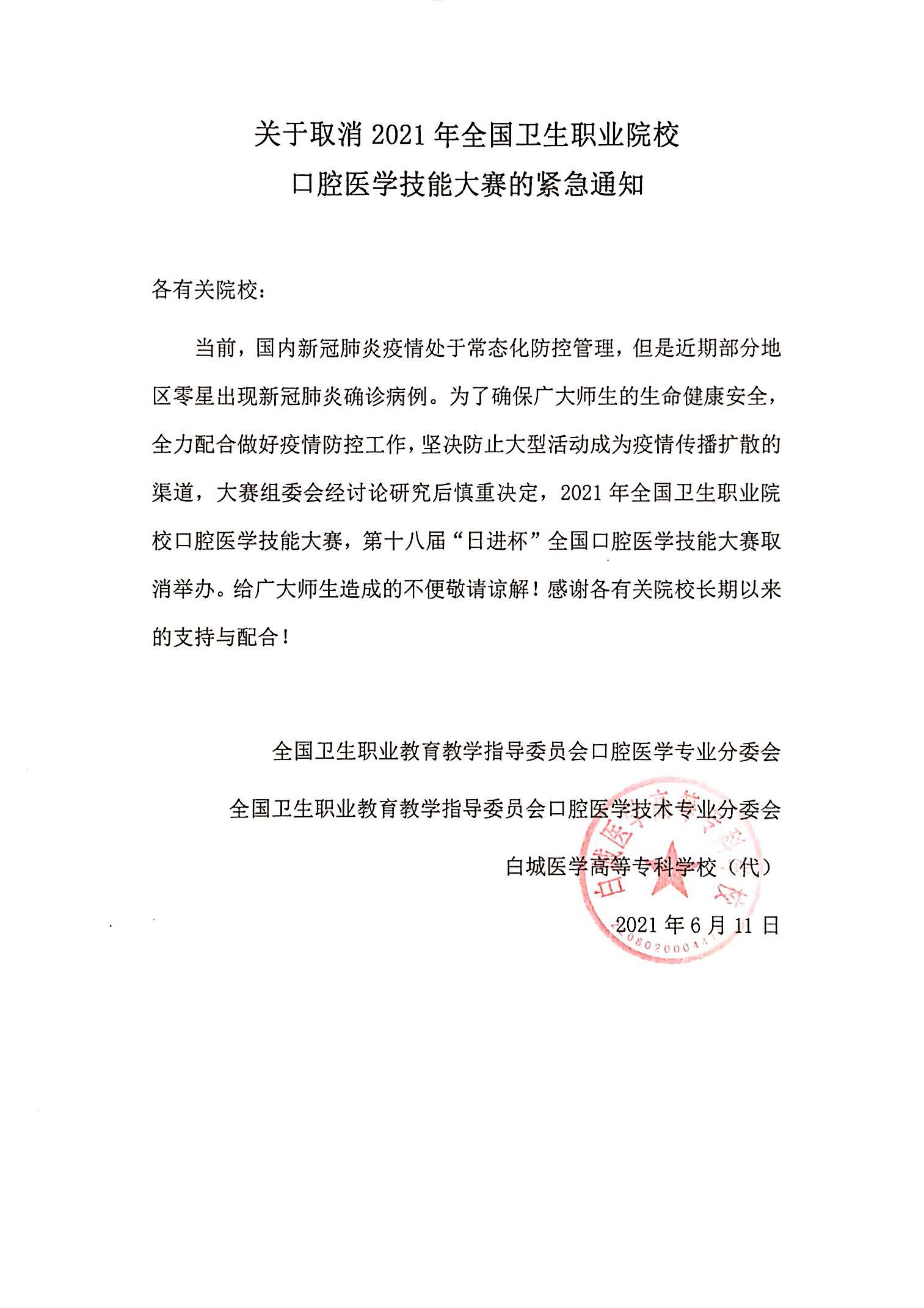 關(guān)于取消2021年全國衛(wèi)生職業(yè)院??谇会t(yī)學(xué)技能大賽的緊急通知