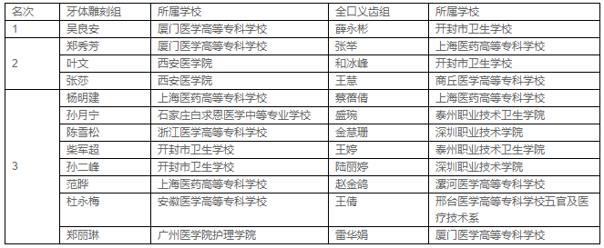 中華口腔醫(yī)學(xué)會(huì)副秘書(shū)長(zhǎng)韓亮先生現(xiàn)場(chǎng)抽取展評(píng)考題,展評(píng)于上午8點(diǎn)30分開(kāi)始,經(jīng)過(guò)3.5個(gè)小時(shí)的努力,各校參賽學(xué)生都完成了自己的作品。中華口腔醫(yī)學(xué)會(huì) 口腔修復(fù)工藝學(xué)專(zhuān)業(yè)委員會(huì)、中華口腔醫(yī)學(xué)會(huì)口腔修復(fù)學(xué)專(zhuān)業(yè)委員會(huì)的周敏主任委員、張富強(qiáng)主任委員等6位評(píng)委對(duì)學(xué)生的作品進(jìn)行評(píng)分。最終,牙體雕刻第一名由 廈門(mén)醫(yī)學(xué)高等專(zhuān)科學(xué)校的吳良安同學(xué)獲得;全口義齒排列及牙齦雕刻第一名由開(kāi)封衛(wèi)校的薛永彬同學(xué)獲得;團(tuán)體第一名的桂冠則由開(kāi)封衛(wèi)校摘得,這是該校連續(xù)第三次獲得此項(xiàng)殊榮。