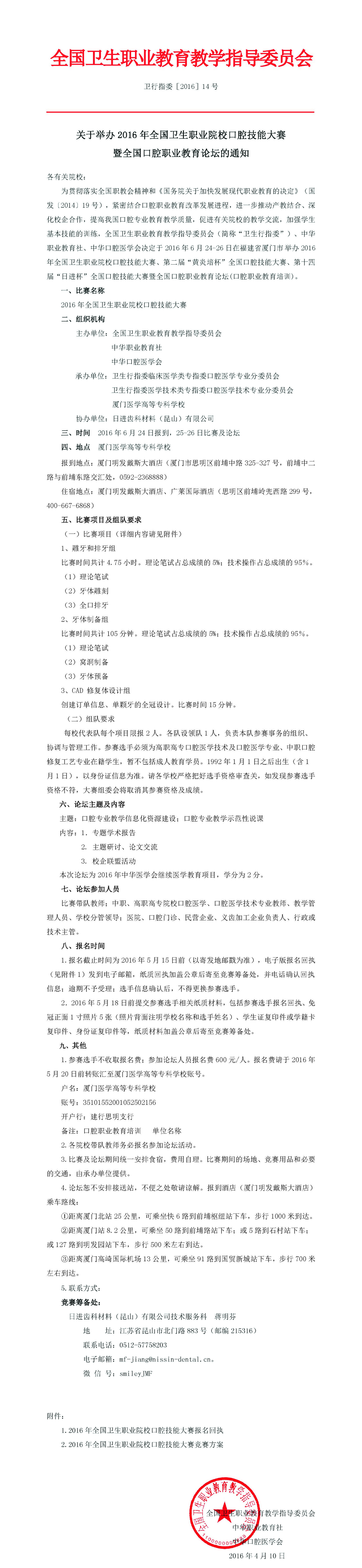 2016年全國衛(wèi)生職業(yè)院校口腔技能大賽、第二屆“黃炎培杯”、第十四屆“日進(jìn)杯”全國口腔技能大賽暨全國口腔職業(yè)教育論壇通知