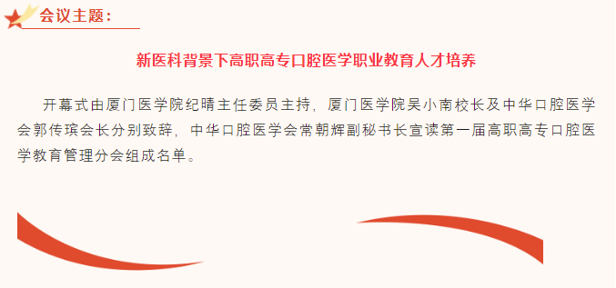 新跨越、新起航,由中華口腔醫(yī)學(xué)會(huì)高職高專(zhuān)口腔醫(yī)學(xué)教育管理分會(huì)主辦、廈門(mén)醫(yī)學(xué)院承辦的中華口腔醫(yī)學(xué)會(huì)高職高專(zhuān)口腔醫(yī)學(xué)教育管理分會(huì)第1次學(xué)術(shù)年會(huì)于2023年6月30-7月2日在福建省廈門(mén)市隆重舉辦。