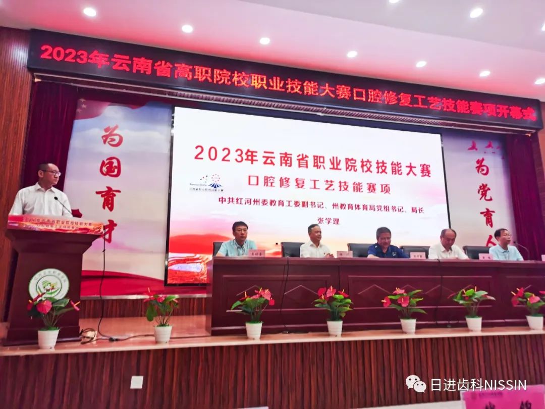 中共紅河州委教育工委副書(shū)記、州教育體育局黨委組書(shū)記、局長(zhǎng)張學(xué)理、紅河衛(wèi)生職業(yè)學(xué)院黨委副書(shū)記、院長(zhǎng)唐飚,黨委委員、副院長(zhǎng)楊軍,日進(jìn)齒科材料(昆山)有限公司培訓(xùn)總監(jiān)趙軍,各參賽學(xué)校領(lǐng)隊(duì)、指導(dǎo)老師、參賽選手等參加了開(kāi)幕式。