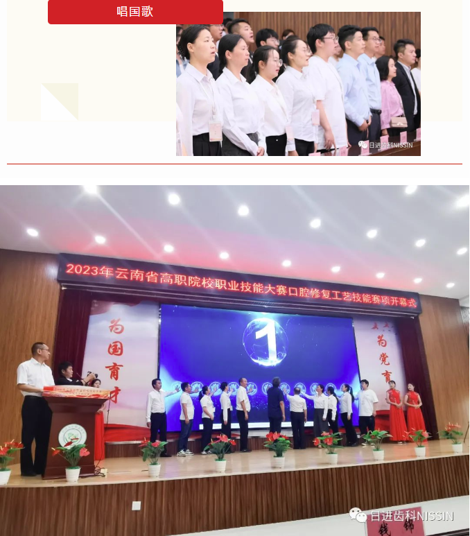 開(kāi)幕式上,全場(chǎng)齊聲高唱中華人民共和國(guó)國(guó)歌,為參賽選手們賽前鼓足了勇氣。同時(shí),與會(huì)領(lǐng)導(dǎo)在全體參會(huì)人員的見(jiàn)證下一起揭幕,迎接2023年云南省高職院校職業(yè)技能大賽—口腔修復(fù)工藝技能大賽的到來(lái)。