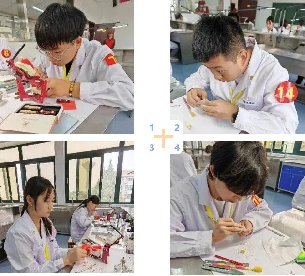 本次競賽主要分為口腔醫(yī)學(xué)組(牙體制備項(xiàng)目)和口腔醫(yī)學(xué)技術(shù)組(雕牙與排牙項(xiàng)目)兩個組別。牙體制備組項(xiàng)目內(nèi)容為11上頜中切牙金屬烤瓷全冠牙體預(yù)備、26牙Ⅱ類窩洞制備。雕牙與排牙組項(xiàng)目內(nèi)容為1:1石膏模仿天然牙齒雕刻,排列上下左右側(cè)人工牙,雕刻上下頜左右側(cè)牙齦。