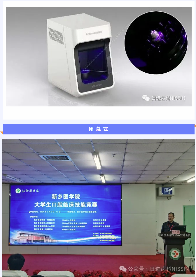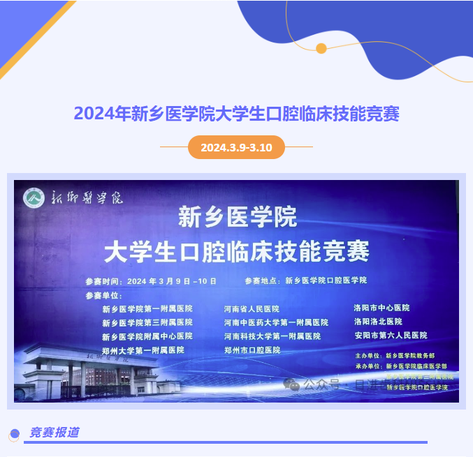 由新鄉(xiāng)醫(yī)學(xué)院教務(wù)部主辦,臨床醫(yī)學(xué)部、第三附屬醫(yī)院、口腔醫(yī)學(xué)院承辦,日進齒科材料(昆山)有限公司協(xié)辦的“新鄉(xiāng)醫(yī)學(xué)院大學(xué)生口腔臨床技能競賽”于2024.3.9-3.10日在口腔醫(yī)學(xué)樓如期舉辦,本次競賽共有11家醫(yī)院的36名選手參加決賽。