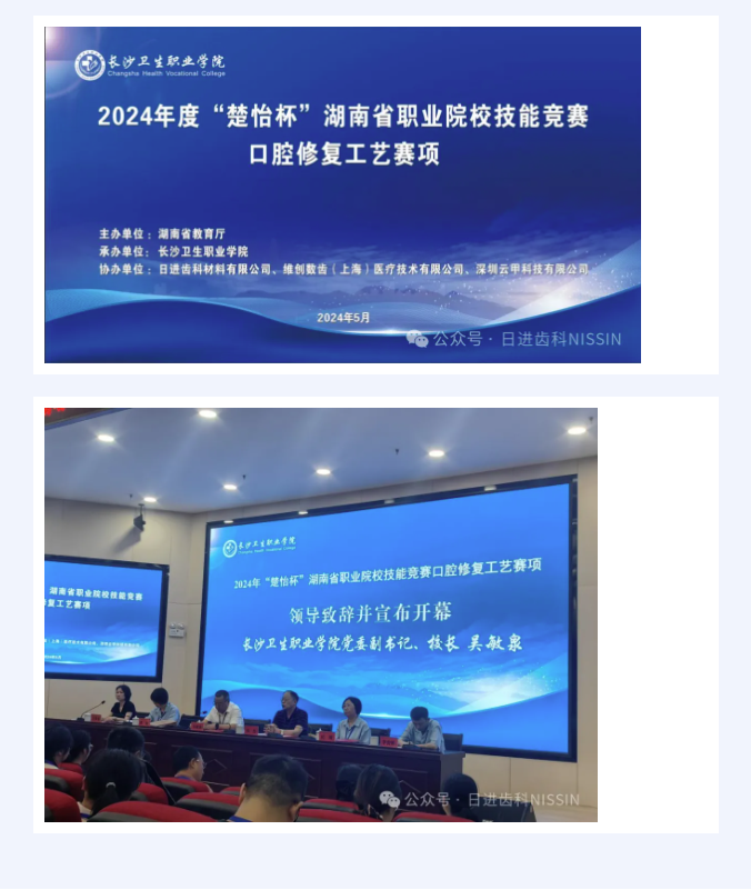 由湖南省教育廳主辦,長沙衛(wèi)生職業(yè)學(xué)院承辦,日進齒科材料(昆山)有限公司協(xié)辦的“2024年湖南省職業(yè)院校技能競賽口腔修復(fù)工藝賽項”于2024年5月26日在湖南長沙成功舉辦。