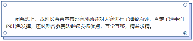 大賽執(zhí)委會(huì)及裁判工作組經(jīng)過(guò)為期2天嚴(yán)謹(jǐn)、公正地評(píng)判,最終在五個(gè)評(píng)分要素的相關(guān)使用要求下,從47支隊(duì)伍中評(píng)選出金獎(jiǎng)5名,銀獎(jiǎng)7名,銅獎(jiǎng)12名共24支獲獎(jiǎng)隊(duì)伍。